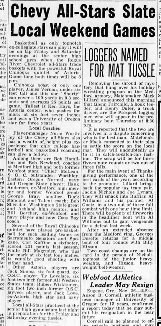 Owner: Wally Palmberg Arena: Astoria Armory Capacity: Standings W L Pct. GB 1947-48 Astoria Royal Chinooks 11 19 .367 10 First HalfThe team did not survive to play the second half of the season. Wally Palmberg was a star at the University of Oregon was the team's owner, coach and player.