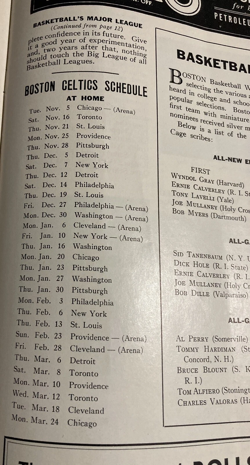 The next game was the Celtics first vs the New York Knicks. The 12-3 Knicks had the best record in the BAA at that time, and had looked really good, while the 3-12 Celtics had the worst record, and the game went exactly as you would have expected. The Knicks crushed the Celtics 90-65. The 25-point loss was the Celtics worst of the season, and the 90 points was the most they would give up that season.